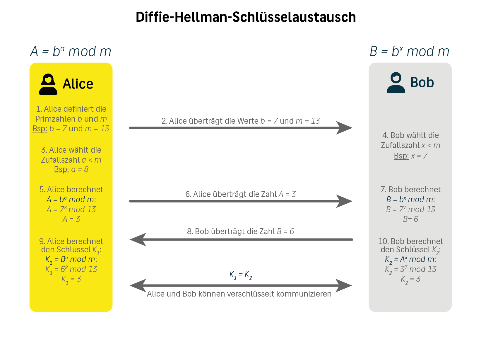 Mit dem Verfahren wird also eigentlich kein Schlüssel ausgetauscht, sondern ein Schlüssel zwischen zwei Kommunikationspartnern vereinbart.