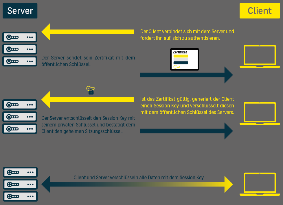 Eine Möglichkeit für einen Verbindungsaufbau bei einer TLS-Verbindung zeigt dies beispielhaft: Ein Client ruft über einen Browser eine Webseite auf, die auf einem externen Webserver gehostet ist. Er bittet den Server, sich zu authentisieren. Der Server schickt sein Zertifikat mit dem öffentlichen Schlüssel an den Client. Dieser prüft das Zertifikat mithilfe des ihm vorliegenden öffentlichen Schlüssels der CA (Informationen zu Zertifikaten und CAs erhalten Sie in unserem PKI-Beitrag). Ist das Zertifikat gültig, generiert der Client einen Session Key (symmetrischer Sitzungsschlüssel), den er mit dem öffentlichen Schlüssel des Servers verschlüsselt. Der Server wiederum kann mit seinem privaten Sitzungsschlüssel den Session Key entschlüsseln, der dann für die Verschlüsselung der Daten und des Datenflusses zwischen Client und Server genutzt wird. Oft kommt hier aber auch das oben beschriebene Diffie-Hellman-Verfahren zum Schlüsselaustausch zum Einsatz.