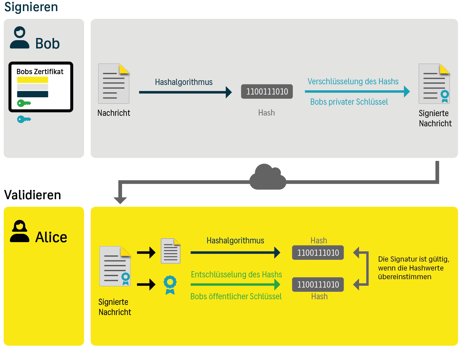 Ob Alice und Bob reale Personen oder Geräte, Maschinen, Dienste etc. sind, ist übrigens unwichtig, denn in der digitalen Welt hat alles und jeder eine eigene digitale Identität. Damit sie sicher kommunizieren können, müssen sie sich folglich vergewissern können, dass es sich bei der jeweils anderen digitalen Identität auch wirklich um Bob bzw. Alice handelt. Dazu weisen sich die beiden mithilfe von digitalen Signaturen aus.
