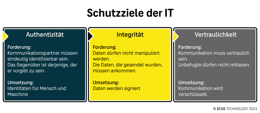 Damit können die Geräte sicher identifiziert werden und es wird sichergestellt, dass ihre gesendeten Daten nachvollziehbar und integer, also nicht manipuliert, sind. Dadurch wird die Einhaltung der drei allgemeinen Schutzziele der IT sichergestellt.