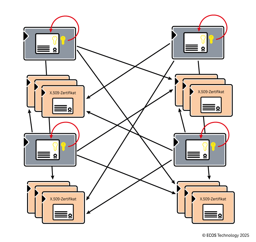 Die CA übernimmt dabei eine ähnliche Rolle wie die Bundesdruckerei bei unseren Ausweisdokumenten: Sie bestätigt kryptografisch, dass eine bestimmte Identität (z. B. eine Anwendung oder ein Gerät) tatsächlich zu einem bestimmten öffentlichen Schlüssel gehört. Durch ihre Signatur wird das Zertifikat zu einer vertrauenswürdigen Maschinenidentität – ohne dass sich die beteiligten Systeme bereits gegenseitig kennen müssen.