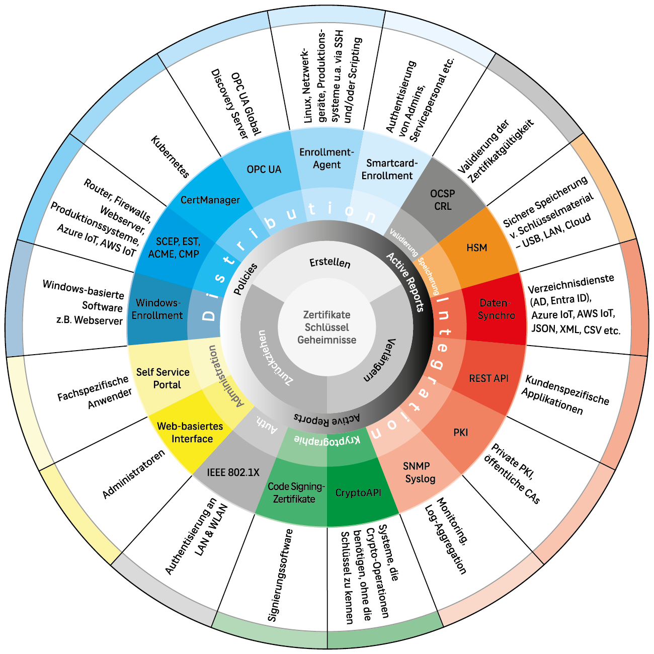 Erstellung, Verteilung und Verlängerung von Zertifikaten und Schlüsseln inklusive Lifecycle-Kontrolle. - Passgenau integrierbar